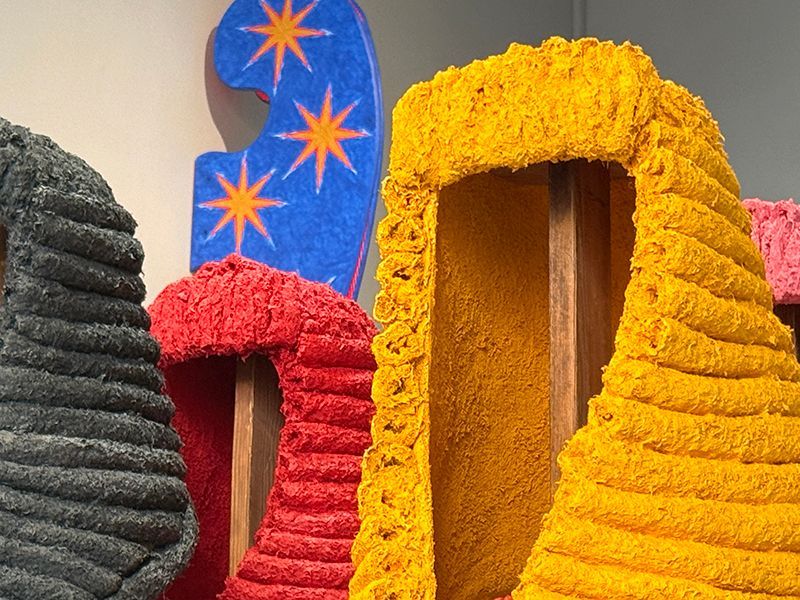 Jefford Horrigan’s geo-poetic observation reminds us that we walk an unsteady path between the competing laws that govern our passage through life. It is a balance disturbed by political and religious intervention to which we must continually adjust and respond; ducking and diving, counter-punching, standing our ground. In Six of One and Half a Dozen of the Other, we are confronted by the juxtaposition of six constructed full bottom wigs and six angels. Paint, salvaged wood and paint-soaked fabric are Jefford Horrigan’s materials of choice in his construction of the twelve works, their ordinariness puncturing the emblematic authority of these symbols of power.